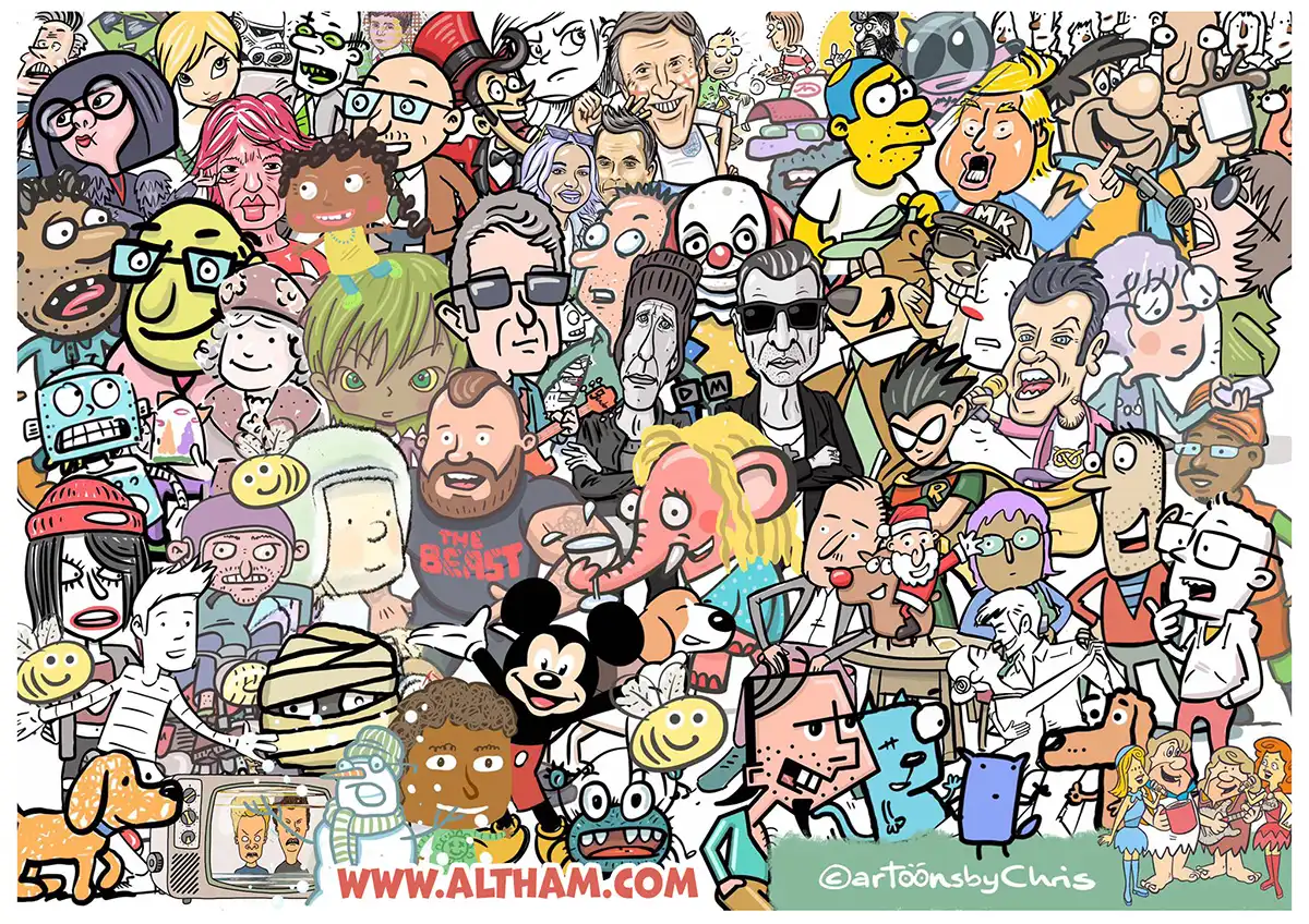 UK Freelance Cartoonist Chris Altham.com is for hire! – For the amount of years I’ve been ‘at it’, I must be one of the most experienced professional cartoonists for hire in the UK. I’ve always worked as a freelancer which has enabled me to be creative on a mass of varied projects for client’s around the world. So, welcome to my cartoon portfolio website, showcasing my scribbles and illustration work as a; commercial freelance cartoonist, mural artist, drawing tutor and creative mix designer. Professional Cartoonists’s Organisation member.